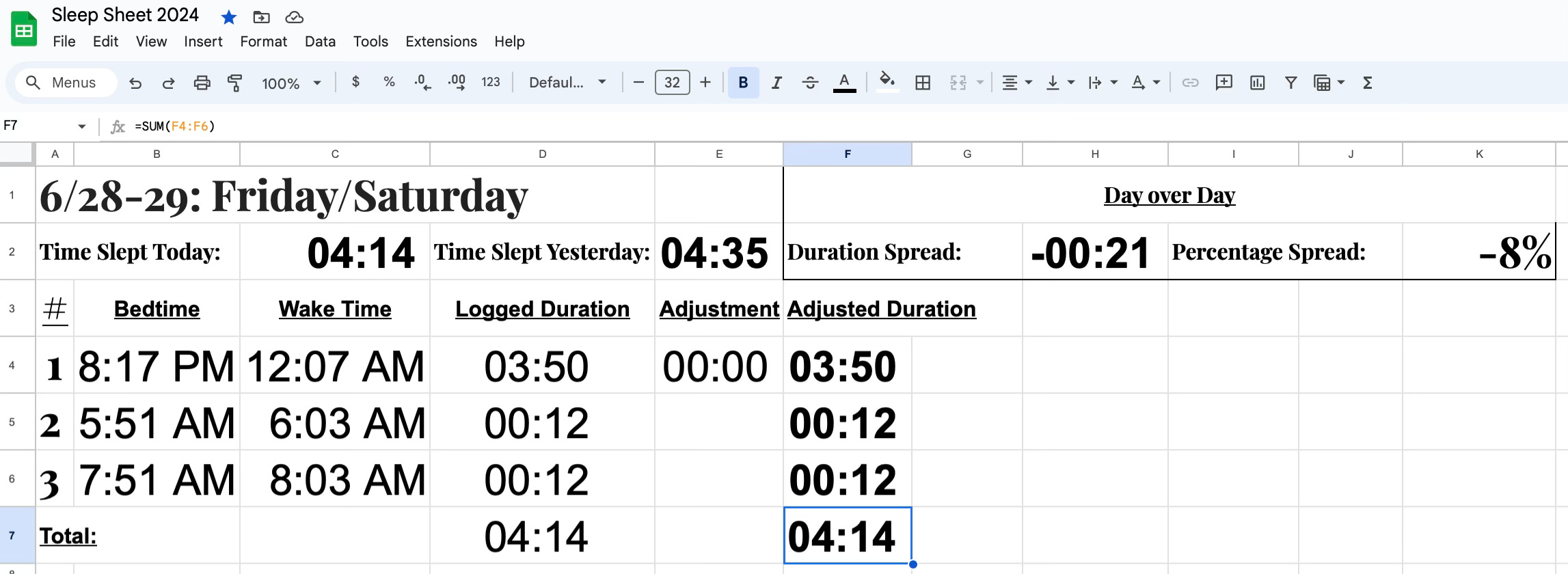 Whenever I bed down or wake up, I tap a button on my phone that logs the time. Later, I plug those times into a spreadsheet I designed for sleep analysis, which I use to tally up my minutes spent asleep. My daily score starts at my nightly bedtime. My night’s sleep lays an initial foundation, which I then build on with naps throughout the day to try to beat my score from the previous day. Here’s a screenshot of today’s tab in my “Sleep Sheet”: